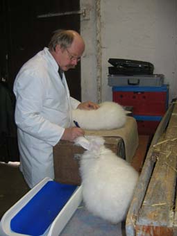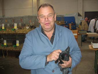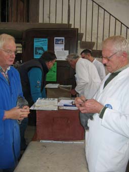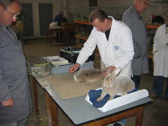 | Zuträger Uwe Barke bei der Arbeit | Preisrichter Jörg Waldmann bei der Bewertung von Lux-Rexen |