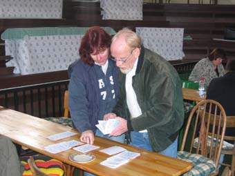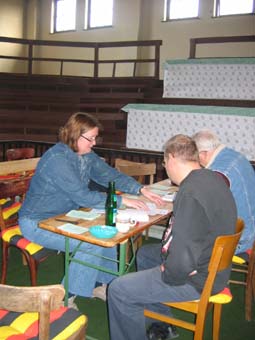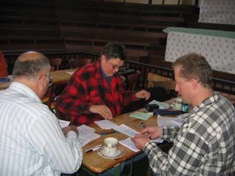 | Manfred Adam und Tochter beim Sortieren der Bewertungskarten | Manfred Schaper, Waldemar Krone und Jörg Waldmann bei der Preisvergabe |