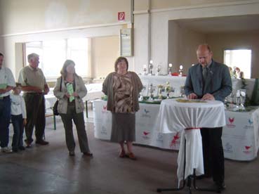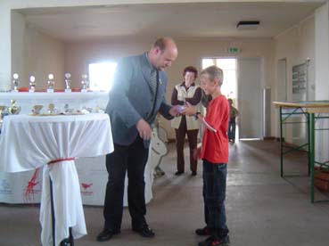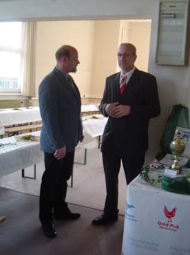 | Auch der Schirmherr Hubertus Werner begrüßt die zahlreichen Gäste. Als Andenken an die Schau übergibt ihm Ullrich Schneemann ein kleines Präsent. | Auch das Geburtstagskind Tobias Handt wird zum 11. Geburtstag gratuliert und erhält eine kleine Überraschung. |